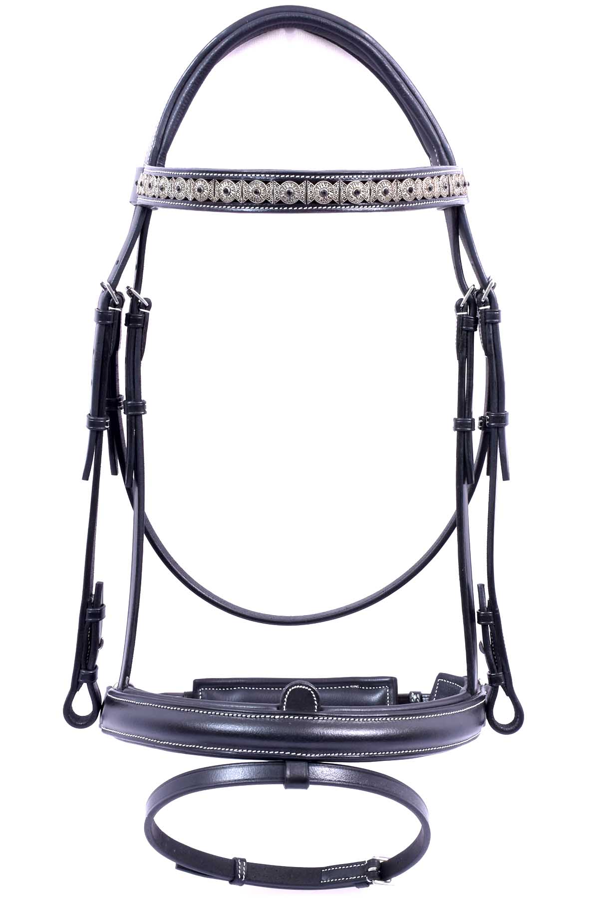 Its made of high quality of Indian tanned leather.Crown style headpiece with soft padded underside which having only two pieces (one cheek piece for the snaffle and one for the noseband).crank noseband with soft leather paded underside. it has a special throat-lash fastener to avoid any additional pressure above the head. Easy adjustment of throat-lash from either side. Soft white leather padded browband with new Antique studded inlay. This bridle is delivered with pairs of antislip reins offering excellent grip. All stainless steel fittings.