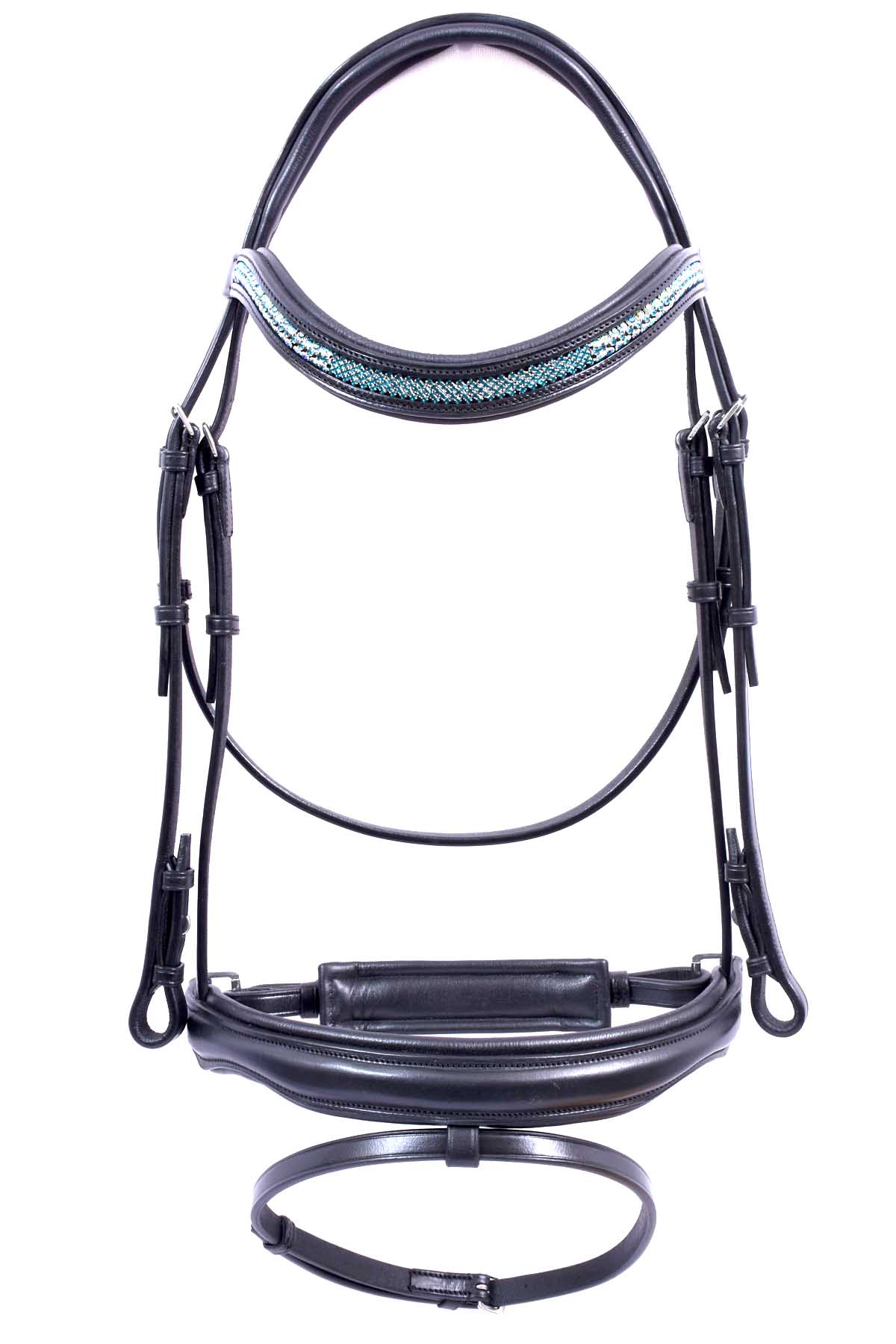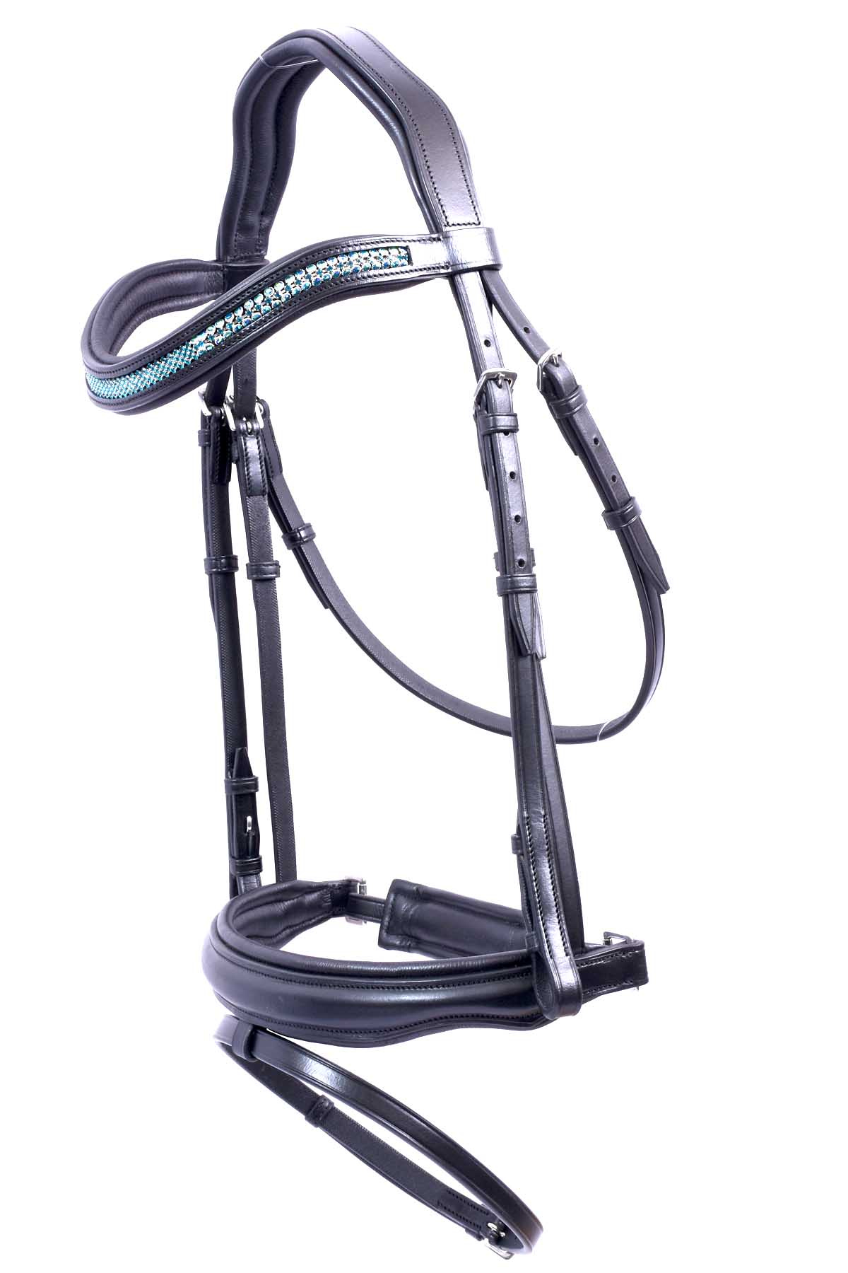 Its made of high quality of Indian tanned leather.Soft leather padded ergonomic style headpiece with only two pieces (one cheek piece for the snaffle and one for the noseband).Anatomical crank noseband with soft leather paded underside. it has a special throat-lash fastener and , to avoid any additional pressure above the head. Easy adjustment of throat-lash from either side. Soft leather padded curved browband with turquoise crystals inlay decorated . This bridle is delivered with pairs of antislip reins offering excellent grip. All stainless steel fittings.